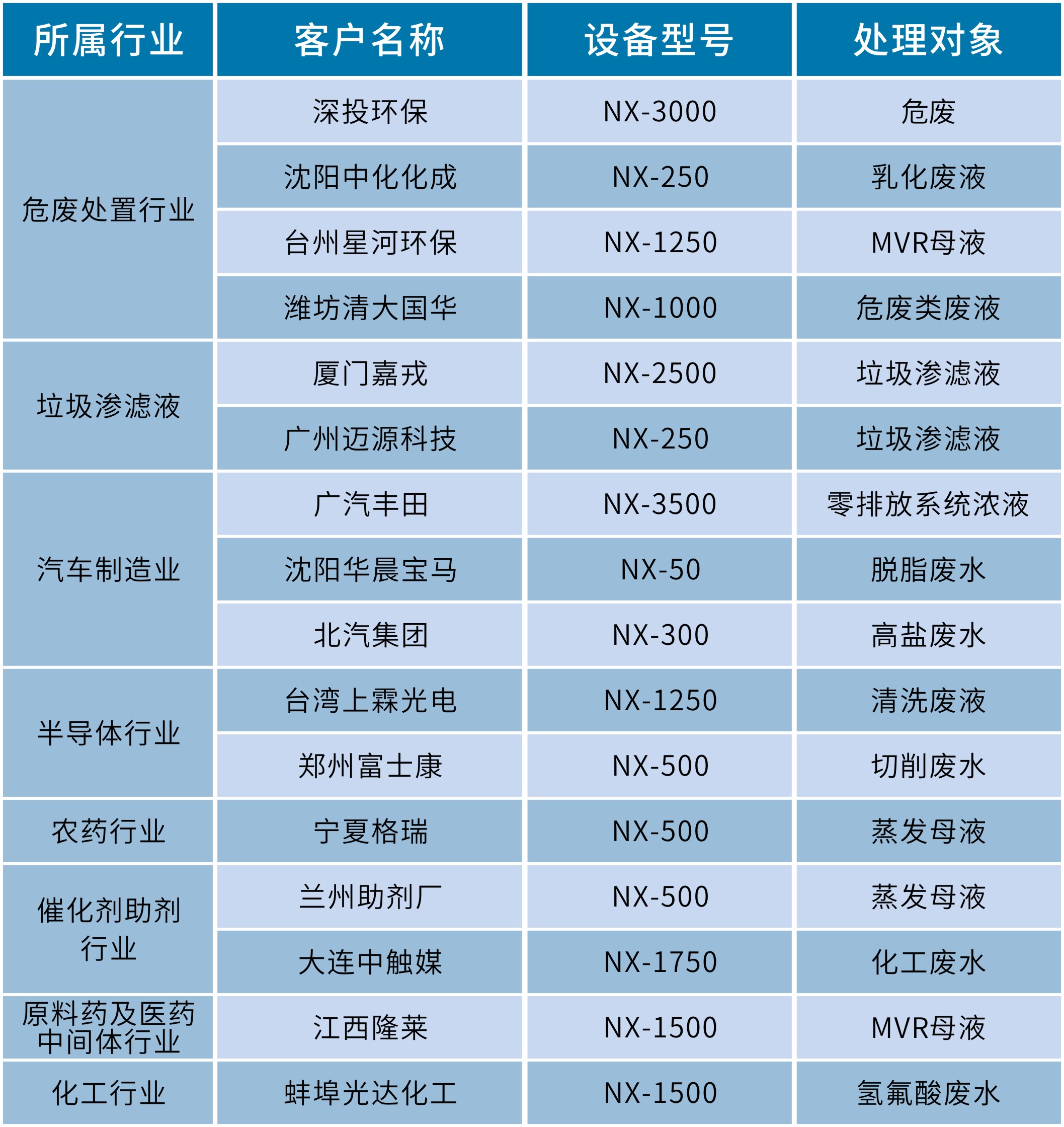 國(guó)內(nèi)超過(guò)120個(gè)案例,涵蓋多個(gè)行業(yè),包括危廢處置行業(yè)、化工行業(yè)、醫(yī)藥行業(yè)、汽車(chē)制造行業(yè)、垃圾滲濾液處理等等